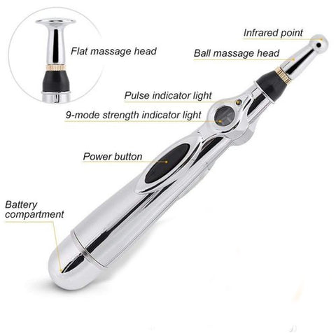 The acupuncture pen has 9 different adjustable intensity levels to choose from and 2 different pen tips (flat tip and rounded tip) to cover all aches and pains