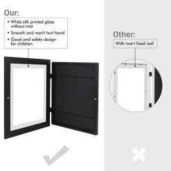 Design:Â 10.4×13.8Â inch frames, perfect for your child’s cherished artwork. The frames can be opened and closed like a book, without mat and fixed nail.Smooth and won’t hurt hand